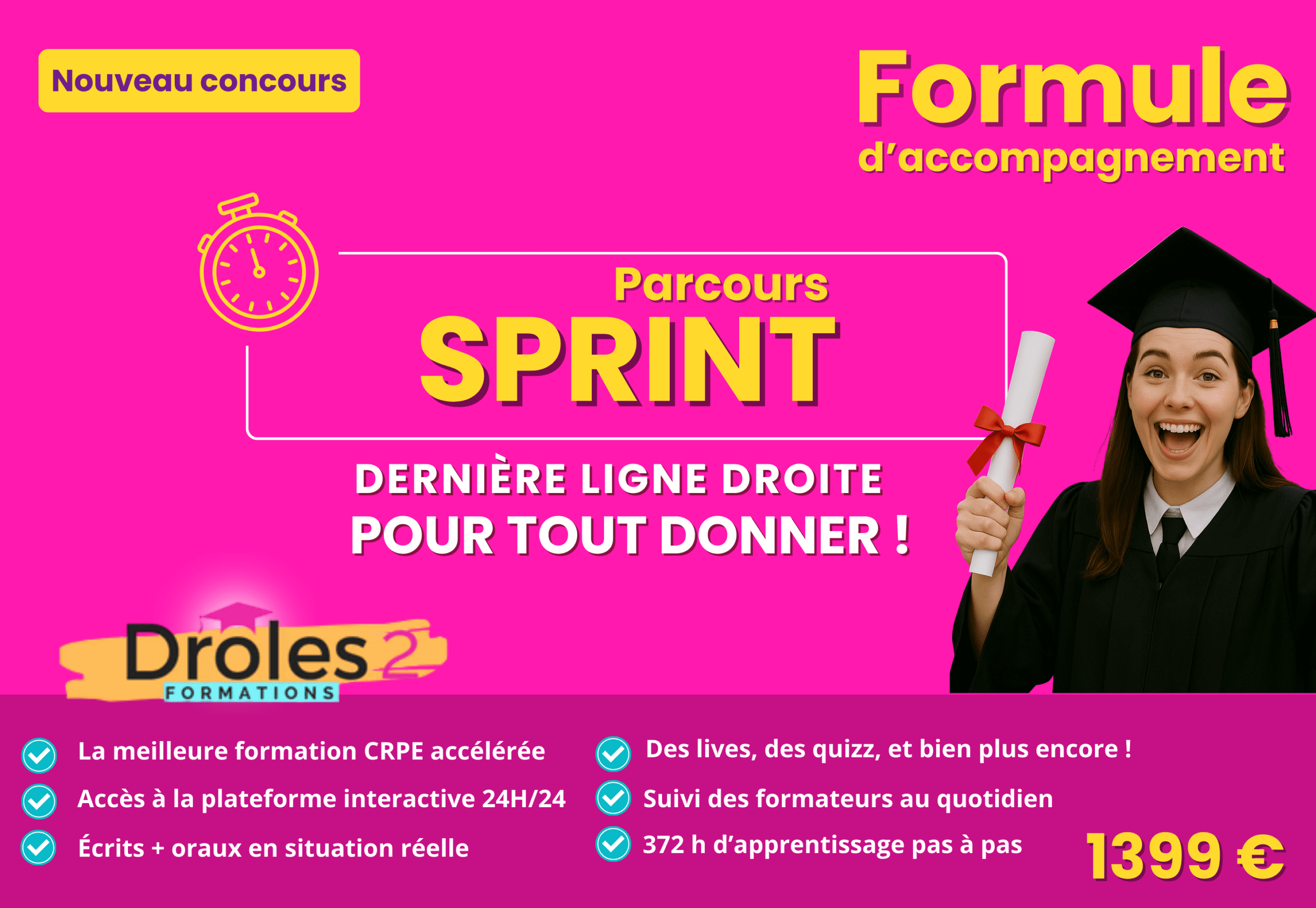 La Formule Sprint est pensée pour celles et ceux qui veulent aller à l’essentiel, combler leurs lacunes rapidement et performer sur les écrits + oraux. Avec 372h de contenu ciblé, des stages intensifs, des concours blancs, et un accompagnement pédagogique sous 48h, tu avances chaque semaine avec un plan clair et efficace.